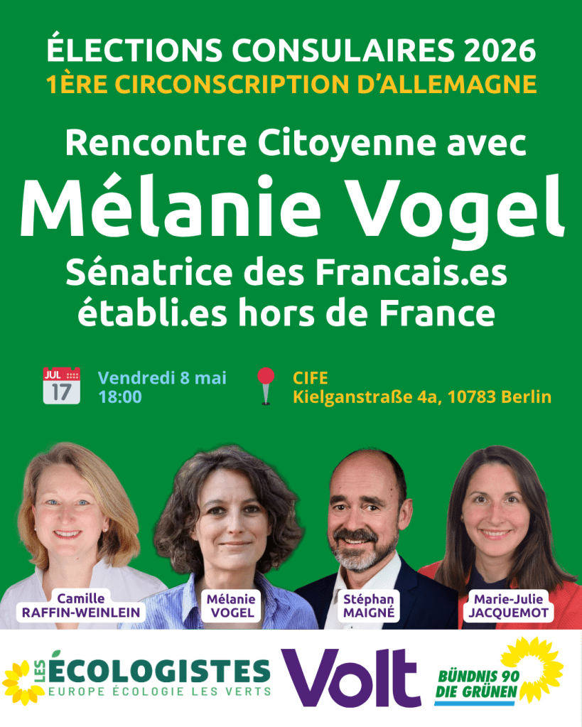 La liste écologiste, sociale et citoyenne est ravie de vous proposer une rencontre avec Mélanie Vogel, sénatrice des Français•es de l’étranger, en présence de vos conseillers sortants Camille Raffin-Weinlein et Stéphan Maigné, et de Marie-Julie Jacquemot, représentante de Volt.